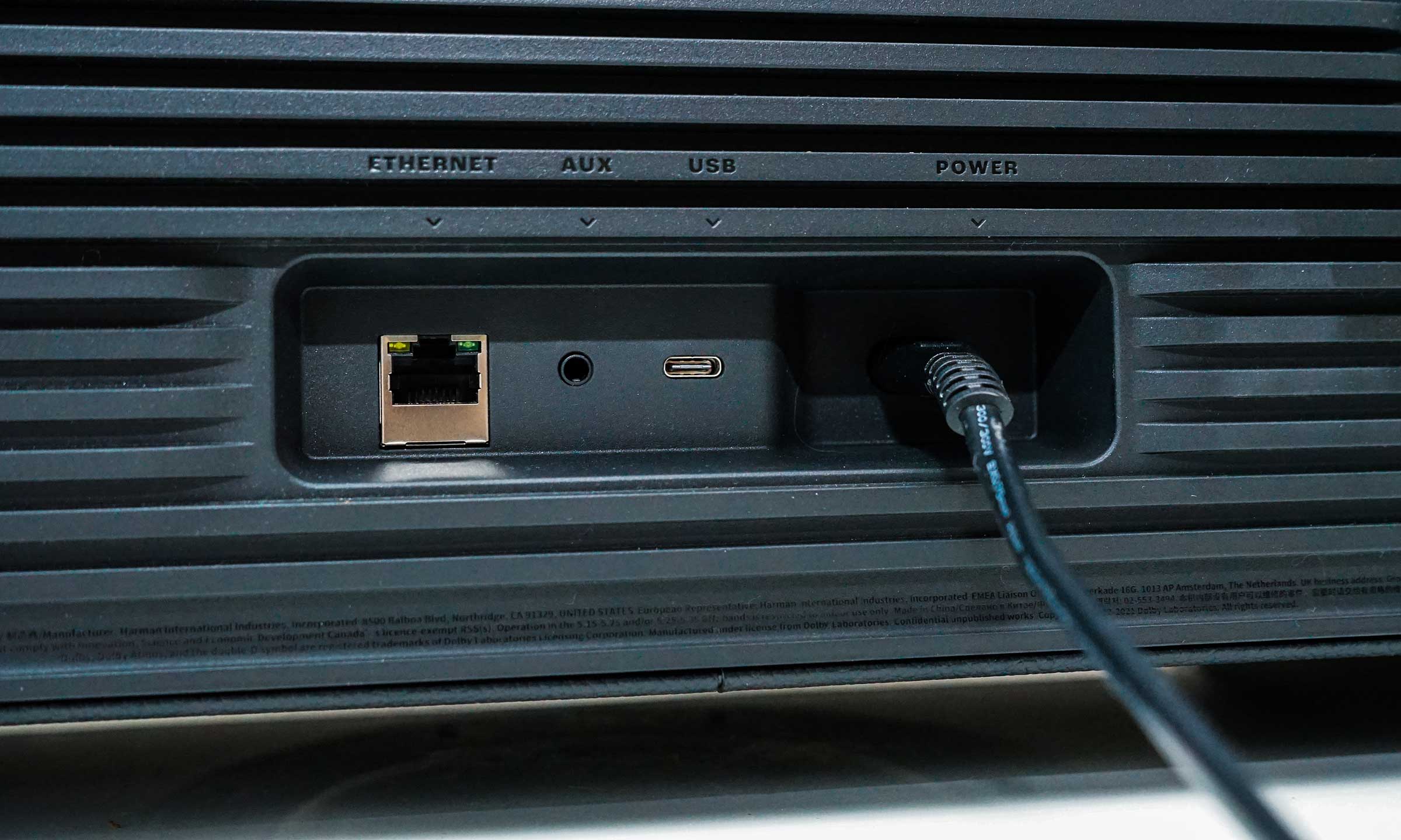 Mặt sau loa bố trí hai lỗ thoát hơi lớn, đảm bảo âm thanh được khuếch đại hiệu quả. Nổi bật là hệ thống cổng kết nối đa dạng, bao gồm: cổng nguồn, cổng Ethernet, cổng AUX và cổng USB-C, đáp ứng mọi nhu cầu kết nối của người dùng.