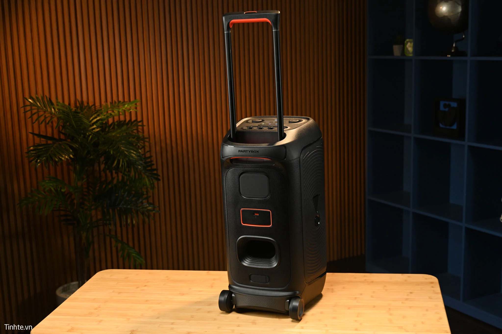 Loa có quai xách và bánh xe ngoại cỡ, rất êm ái. Khi cần di chuyển ta có thể kéo loa đi như vali vậy.