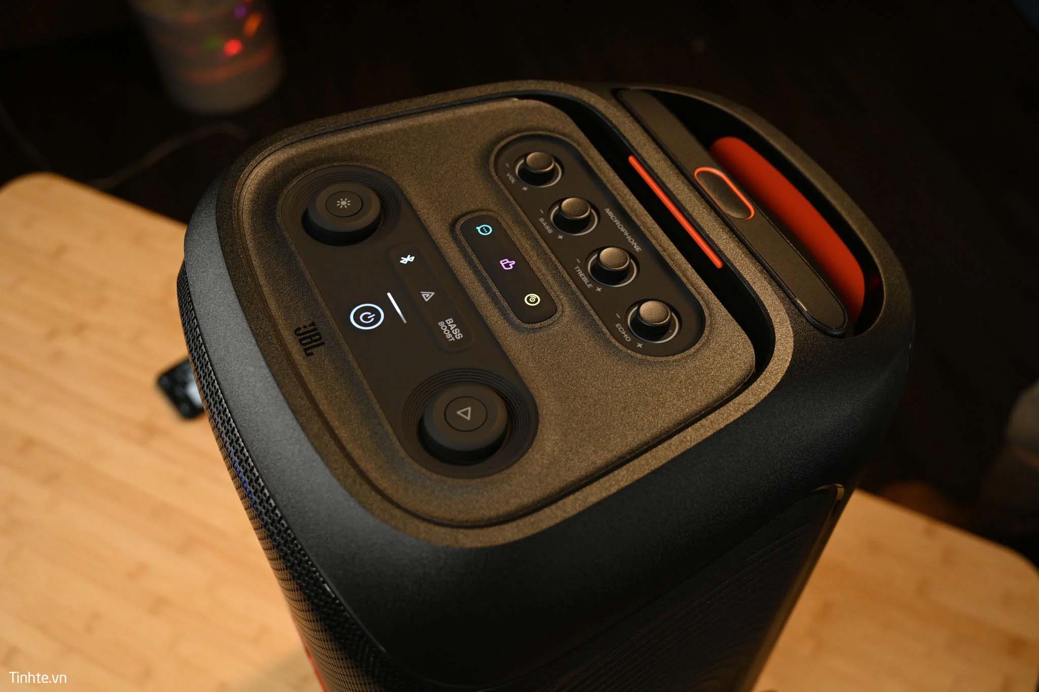Phía trên loa là các nút điều khiển. Nổi bật nhất là cụm nút chỉnh riêng cho giọng hát với volume, bass, mid, treble, echo tách rời cho phép ta dễ chỉnh. Phía dưới là các cụm nút hiệu ứng âm thanh như hò reo, like... để làm gì thì mình chưa nghĩ ra ngữ cảnh để sử dụng. Hãng bảo tính năng này là để khuấy động các cuộc vui, cá nhân mình lại thấy nó hơi vô tri, anh em xem video sẽ rõ hơn.